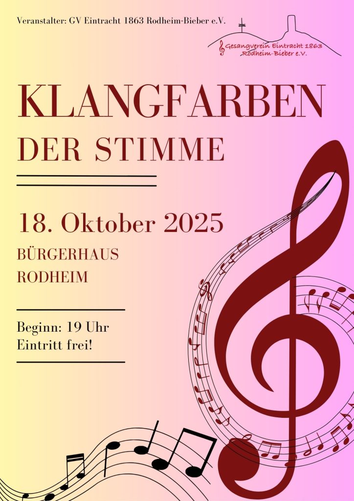 Am 18.Oktober 2025 öffnet das Bürgerhaus Rodheim seine Türen für einen besonderen musikalischen Abend. Unter dem Motto „Klangfarben der Stimme“ präsentieren wir ab 19 Uhr eine Vielfalt an beeindruckenden Stimmen und Ausdrucksformen – denn die Stimme ist das Instrument des Jahres!